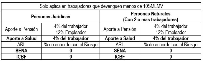 - En el caso de que el empleador sea una persona jurídica, la exoneración de los parafiscales y aporte en salud aplica únicamente respecto a los trabajadores que devenguen menos de 10 salarios mínimos, como lo indica el Art. 114-1 del estatuto tributario así: “Estarán exoneradas del pago de los aportes parafiscales a favor del Servicio Nacional del Aprendizaje (SENA), del Instituto Colombiano de Bienestar Familiar (ICBF) y las cotizaciones al Régimen Contributivo de Salud, las sociedades y personas jurídicas y asimiladas contribuyentes declarantes del impuesto sobre la renta y complementarios, correspondientes a los trabajadores que devenguen, individualmente considerados, menos de diez (10) salarios mínimos mensuales legales vigentes.”